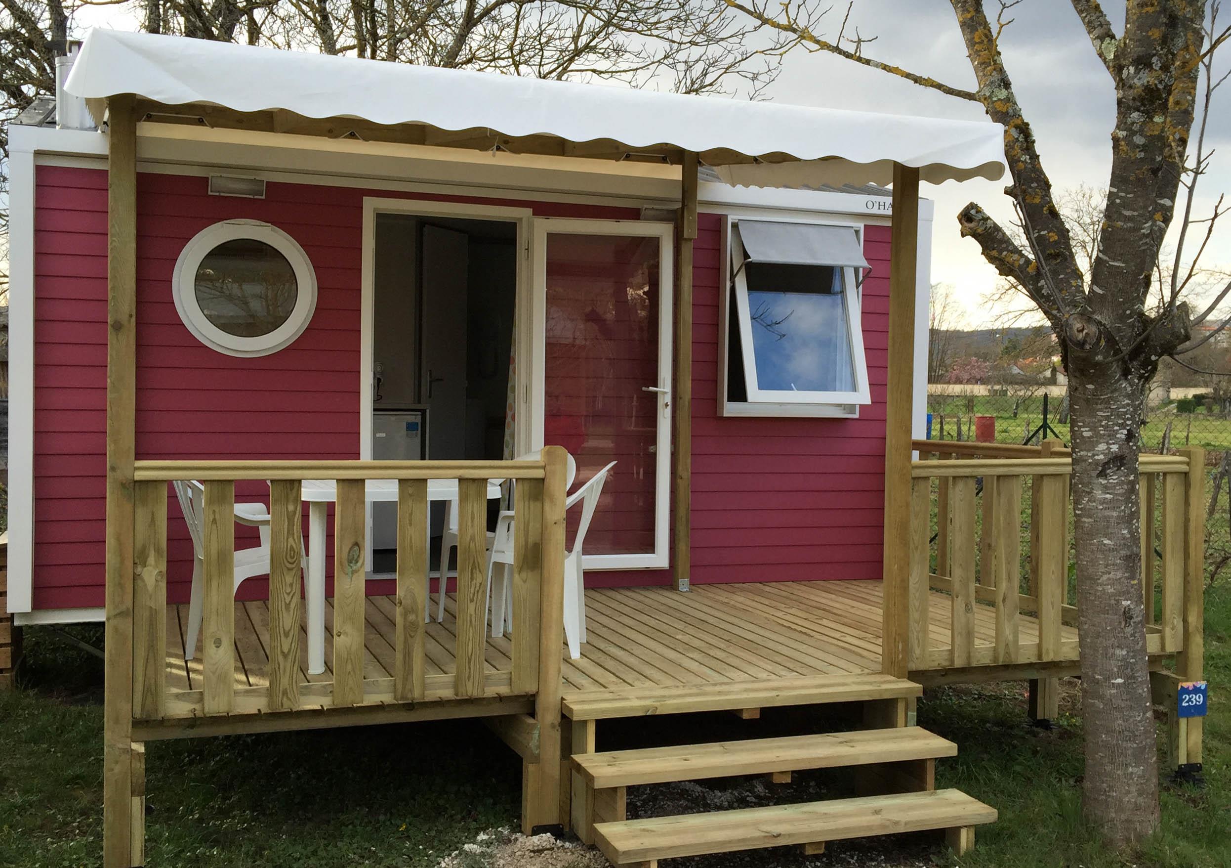 Ses 2 chambres (lit double 160cm x 190cm , lits simples 90x190cm) , sa grande terrasse semi-couverte de 18m2, son séjour avec télévision et sa salle d’eau vous séduiront pour vos futures vacances en Dordogne.
