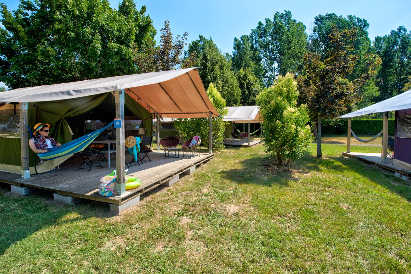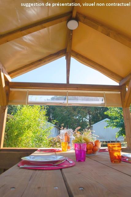 Notre tente exclusive Flower Camping de 37m2 pour 5 personnes (sans sanitaire ni SBD ni arrivée d’eau : bloc sanitaire à proximité) saura vous séduire par sa grandeur, sa modernité et son ouverture sur l’environnement avec sa grande terrasse pour en profiter pleinement.