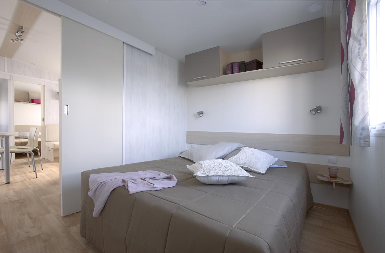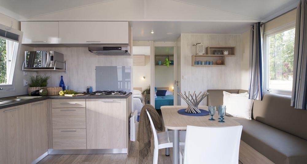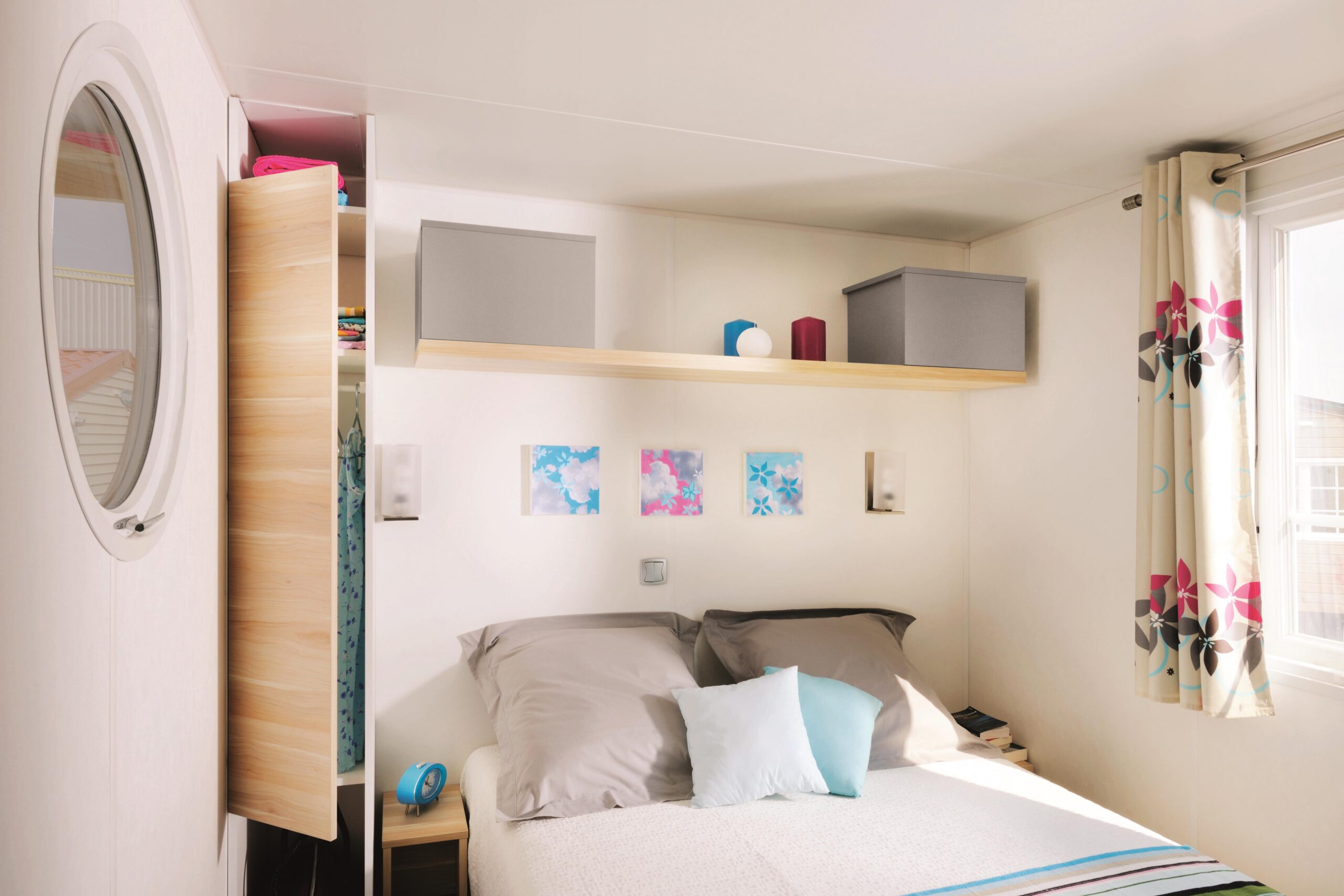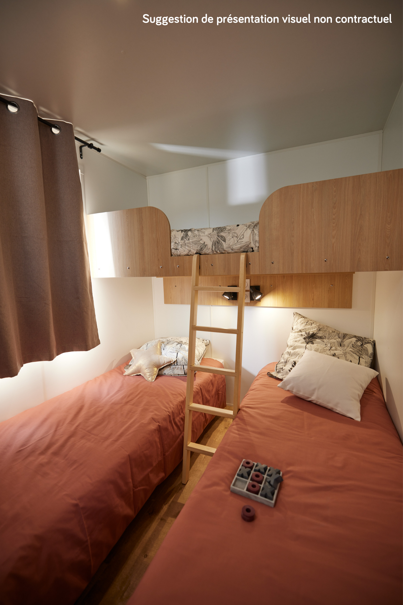 Grande cuisine et son retour bar, terrasse spacieuse et panoramique, séjour avec TV et CLIM, sa belle salle d’eau communicante avec la chambre parentale (1 lit double 160x190cm) et sa chambre enfant (2 lits simples 90x190cm) avec draps inclus … Notre Mobil-Home Premium de 30m2 saura vous séduire et vous faire passer des vacances tout confort.