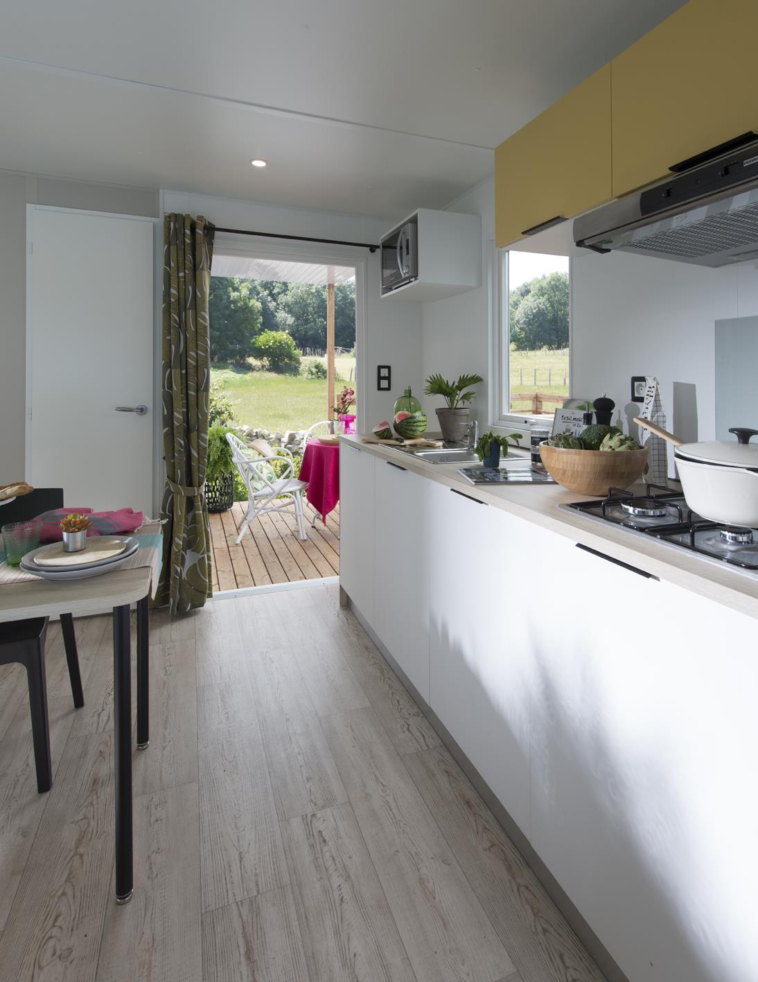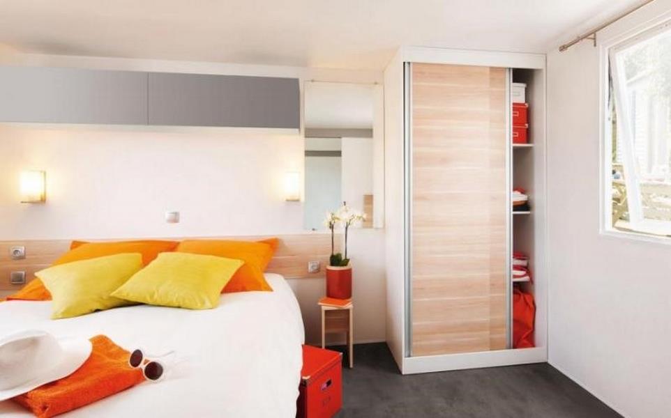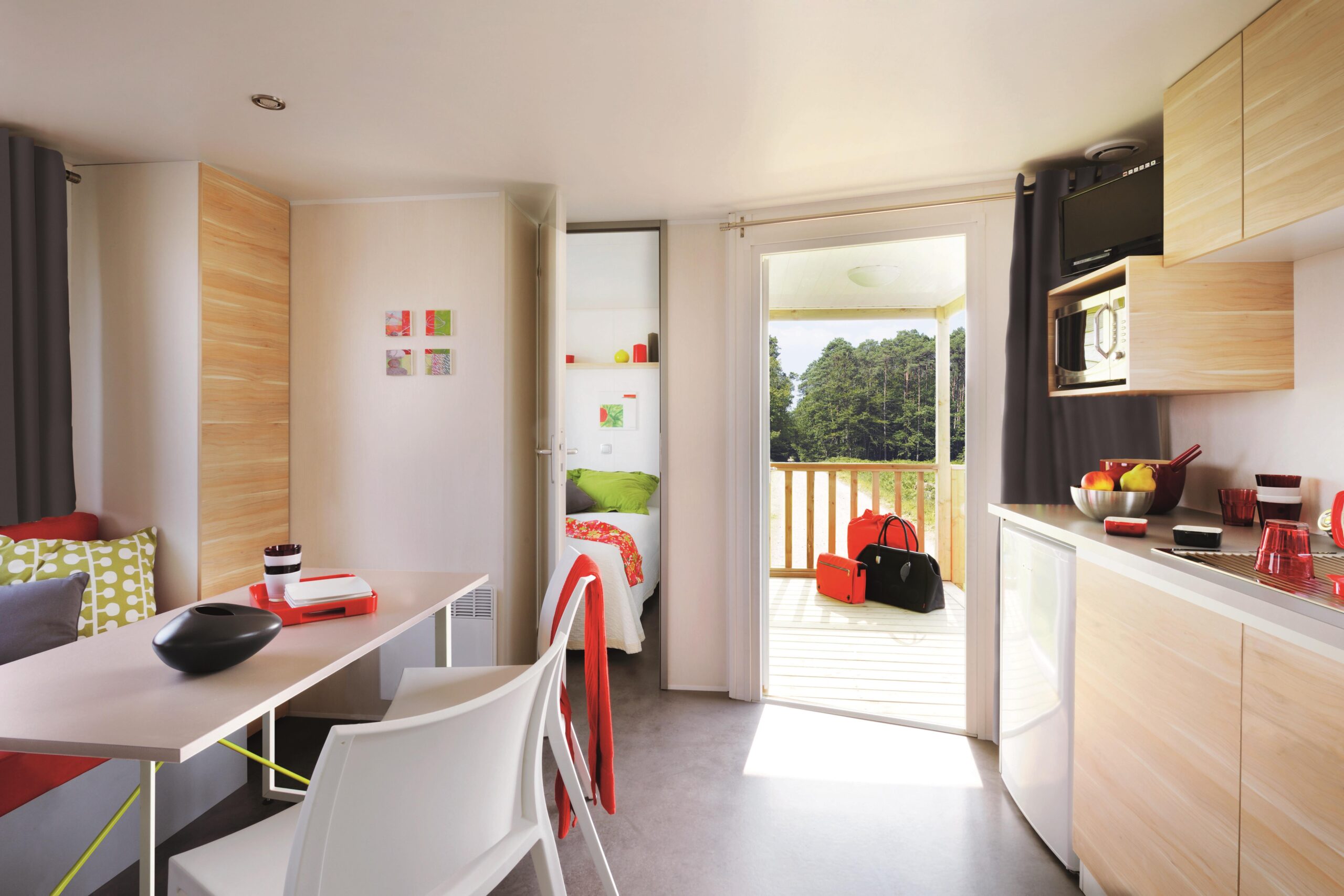 Grande cuisine et son retour bar, terrasse spacieuse et panoramique, séjour avec TV et CLIM, sa belle salle d’eau communicante avec la chambre parentale (1 lit double 160x190cm) et sa chambre enfant (2 lits simples 90x190cm) avec draps inclus … Notre Mobil-Home Premium de 30m2 saura vous séduire et vous faire passer des vacances tout confort.