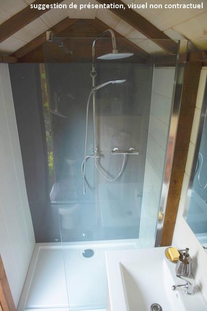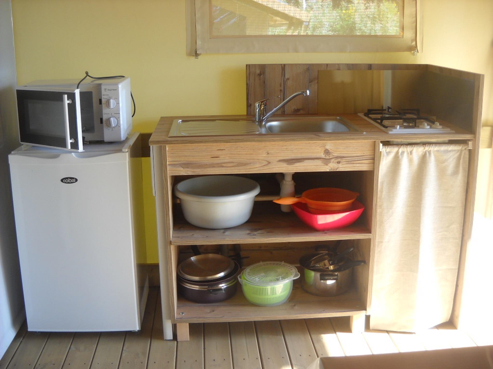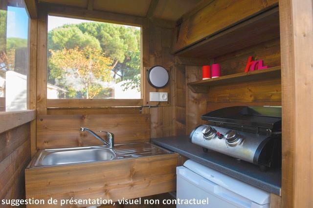 Vous profiterez d’un confort optimal grâce à notre cabane avec son sanitaire privatif, son coin cuisine composée d’un d’un évier, mini réfrigérateur et de plaques de cuisson,