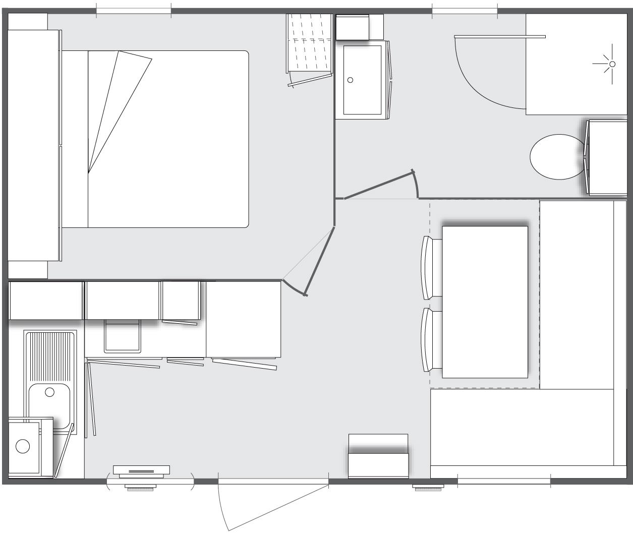 Pratique, douillet avec sa grande terrasse semi-couverte, son grand coin cuisine et son séjour avec TV, sa chambre double (lit double 160x200cm) et sa salle d’eau avec wc, notre Mobil-Home Confort est le choix économique et confortable.