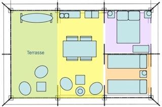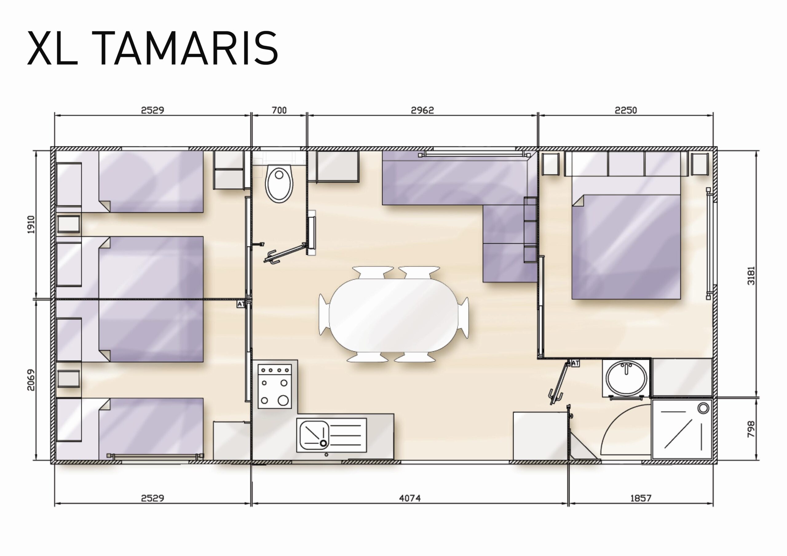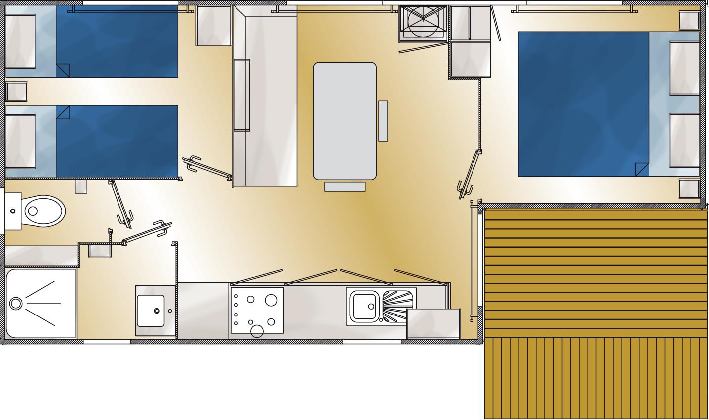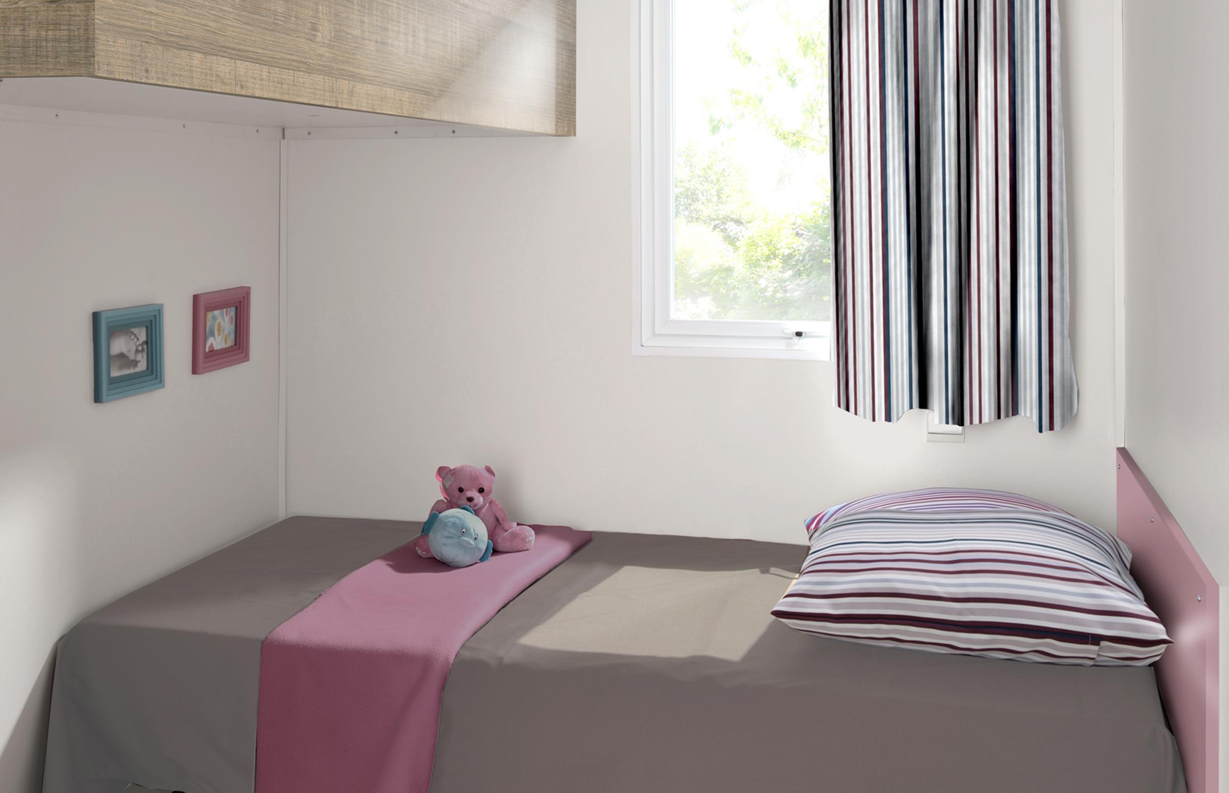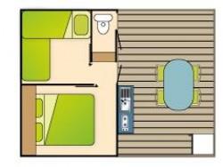 Pratique, douillet avec ses 2 chambres (lit double 160cmx190cm, 2 lits simples 90x190cm) sa terrasse semi-couverte de 7m2, son séjour avec sa télévision et sa salle d’eau, notre Mobil-Home Confort est le choix économique et confortable.