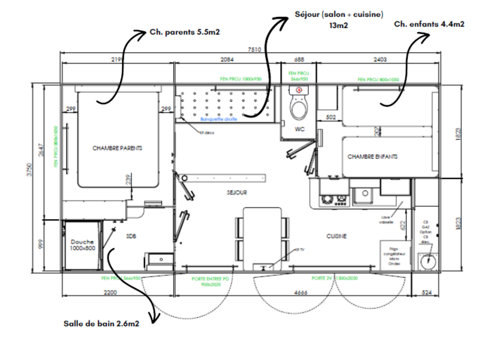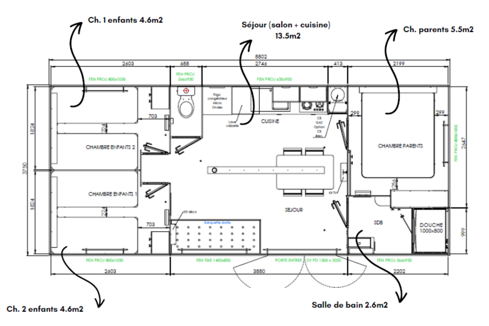 Le Mobitoile avec sanitaires: 2 chambres (1 lit 160×200, 3 lits 80×190 dont 1 en hauteur, 1 couette par lit et 1 oreiller par personne, coin cuisine avec batterie de cuisine, réfrigérateur, 2 feux gaz, cafetière électrique, micro-onde, évier) WC, terrasse avec salon de jardin. SANS SALLE DE BAINS.