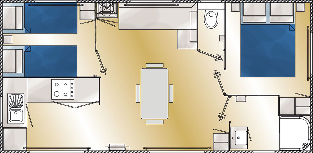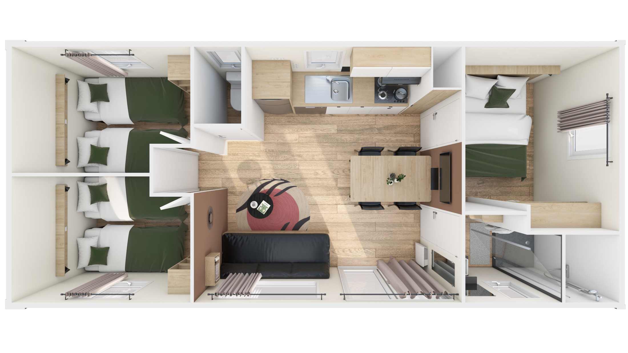 Meilleur rapport qualité/prix, découvrez notre joli mobil-home tout équipé de 31m2 pouvant accueillir jusqu’à 7 personnes. Pratique, douillet avec sa terrasse, son séjour, ses 3 chambres (4 lits simples 80 x 190 cm dont 2 superposés, 1 lit double 160 x 200 cm) et sa salle d’eau, notre Mobil-Home Confort est le choix économique et confortable.