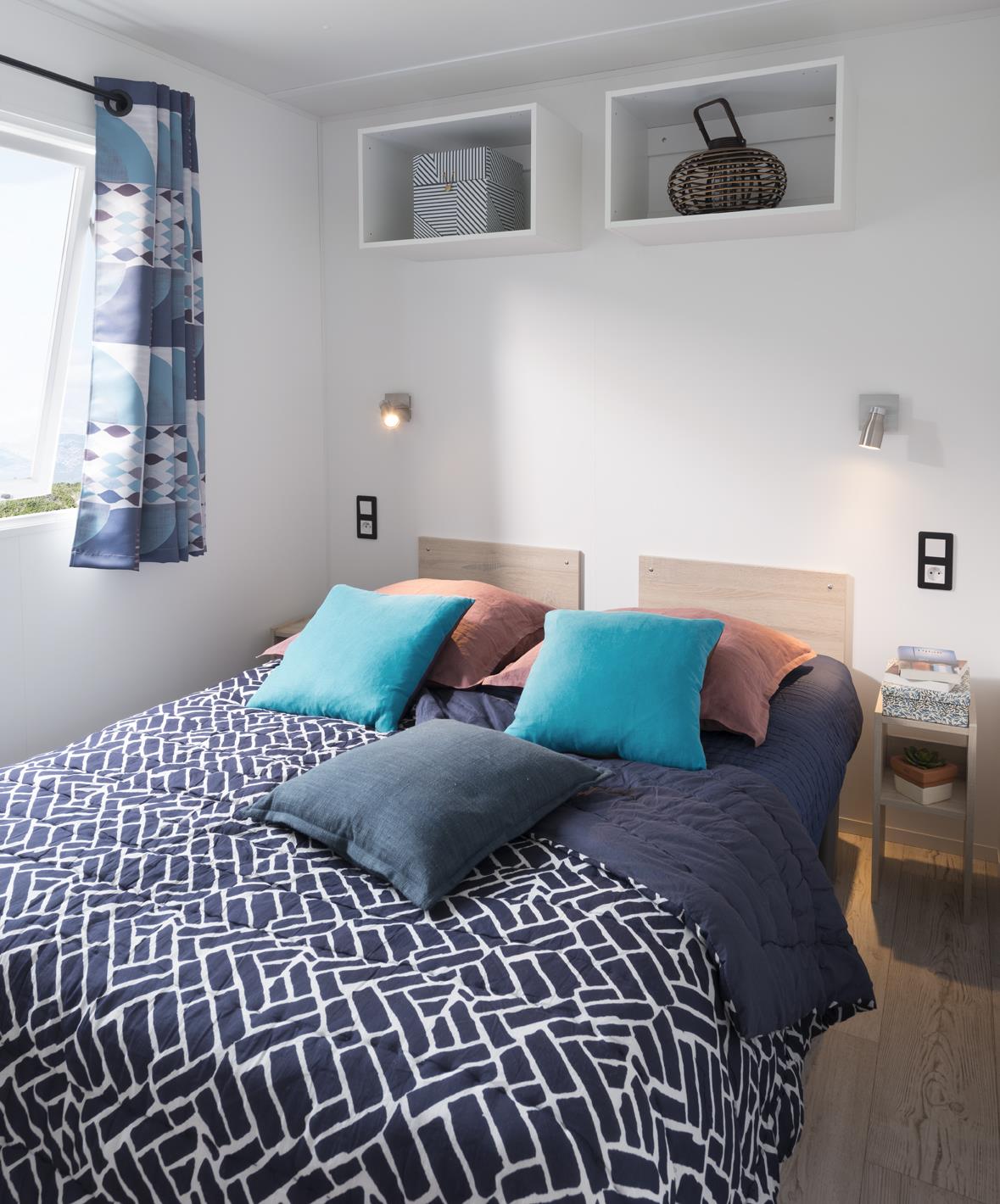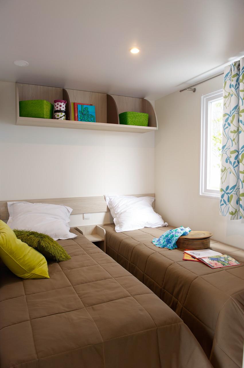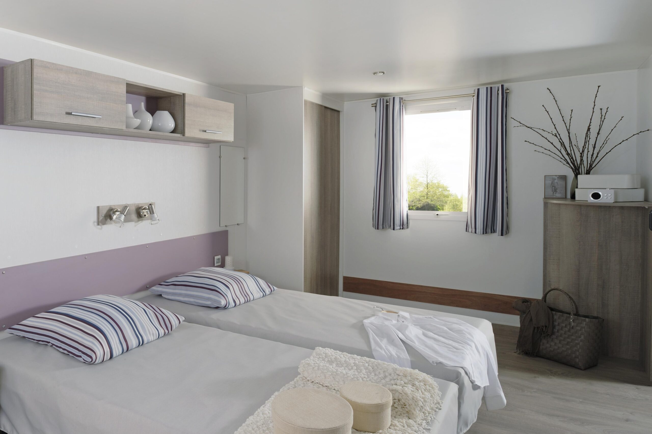 Découvrez tout nouveau notre mobil-home premium dernier cri de 29m2 avec ses prestations haut de gamme pour 4/5 personnes. Climatisation, stores occultants pour un sommeil optimal, moustiquaires dans les 2 chambres (2 lits simples 80 x 190 cm, 1 lit double 160 x 200 cm) avec draps et serviettes inclus, lave-vaisselle, grande terrasse semi-couverte privative de plus de 20m2, superbe intérieur moderne et sa décoration actuelle, salon avec TV.